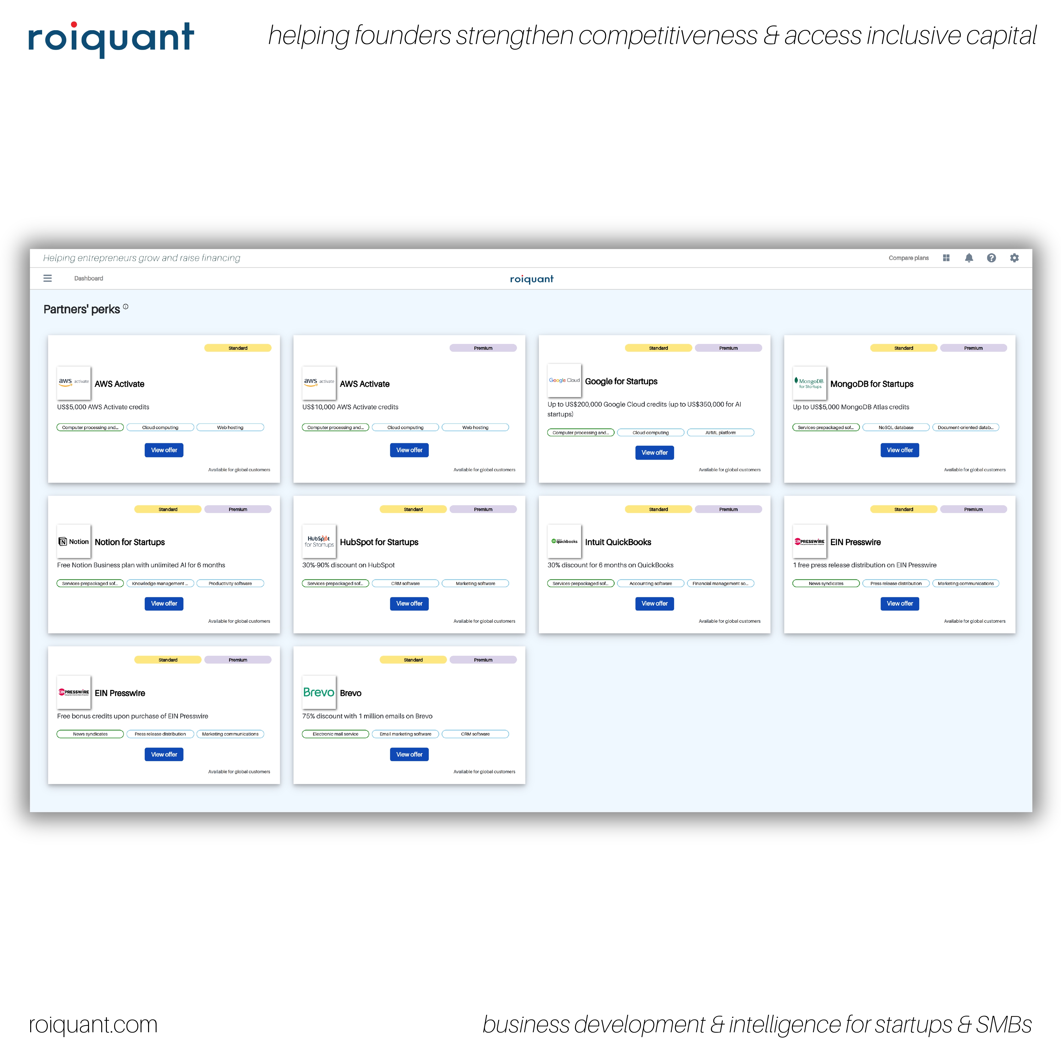 Affiliate partnership: roiquant works with numerous partners around the world, referring their affiliated startups to pay for roiquant’s annual subscription plans to benefit from its BDI solution, as well as the partners’ perks from its Partners Marketplace.